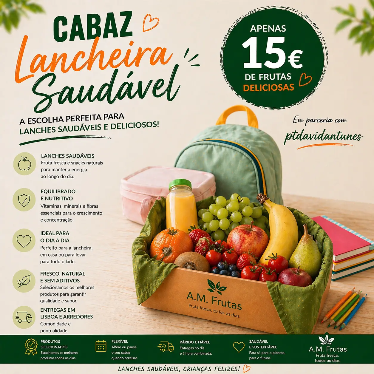 Nem sempre é preciso gastar muito para comer bem. Este cabaz foi pensado para o dia a dia real… trabalho, escola, pouco tempo… e ainda assim ter sempre fruta fresca e opções práticas à mão.